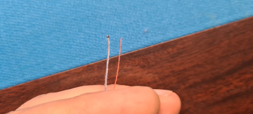 The string thickness matters. Standard sewing thread (40 weight) is too thin. The one I use is around 0.4mm thick polyester (18-20 weight). Below is a picture of red standard thread, and the grey string (consisting of 4 ply) I currently use. The balls roll over it nicely even at slower speed. Obviously, if a ball is rolling very very slowly, the string will interfere, as is the case with a template rack.